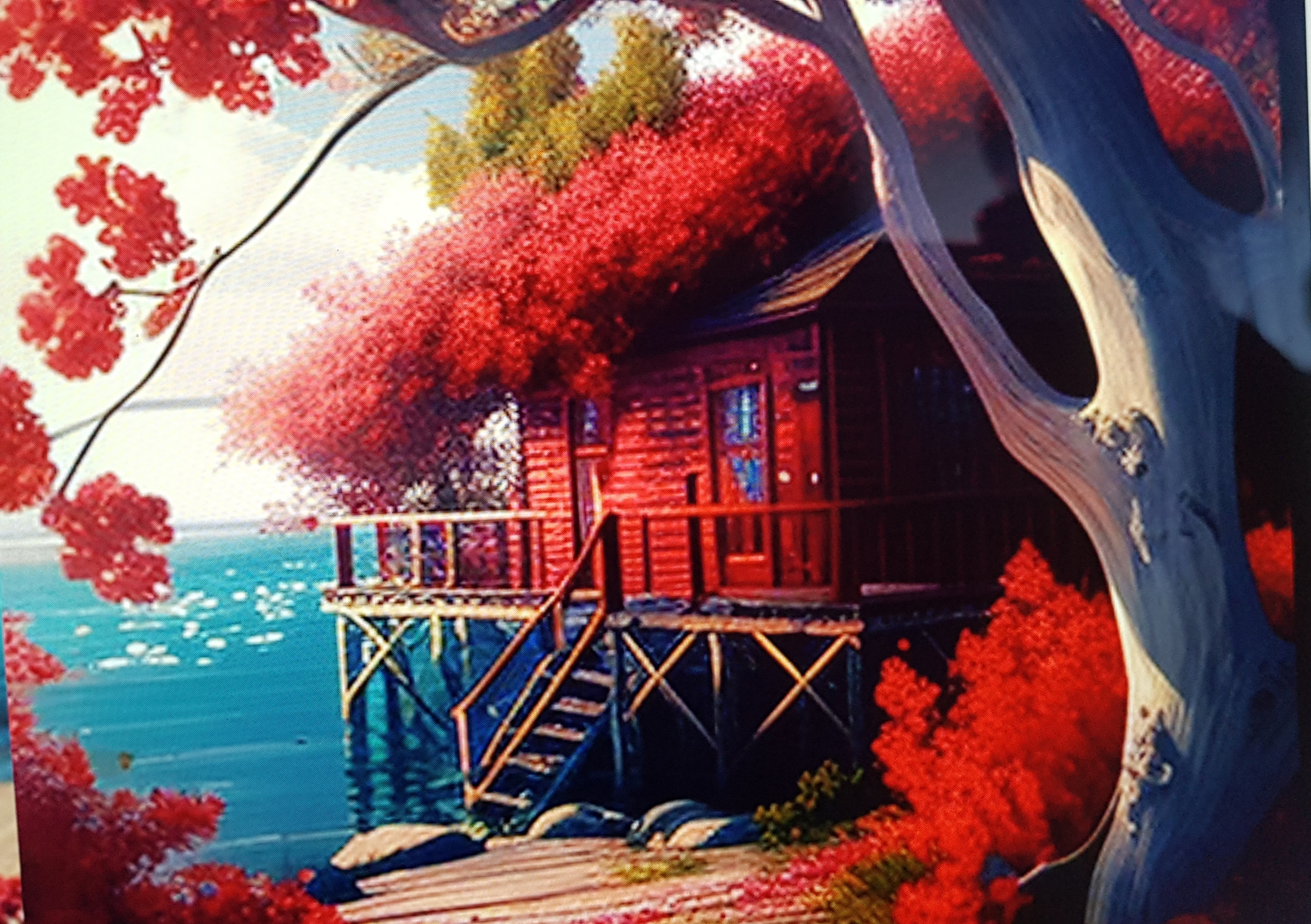 Sitten pyysin sitä luomaan maiseman, jossa olisi pieni punainen mökki, meren ranta ja laituri. Näin se loi: